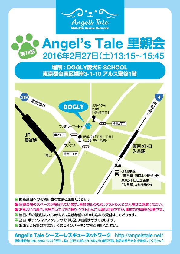 グーちゃんのご報告、 ちょこちょこいただいておりまーす! (いただいたメールの抜粋です) ☆5日目 今日は寒いので、ヒーターの前で丸まっていますが、 寝ているわけではなく、こちらを窺っています。 今日は、初めて 午後から一人でお留守番でした。 どうしていたのでしょうねぇ(笑) 帰宅時は尻尾を振って、大歓迎でした。 こちらは全然、不安なことはないですよ。 我が家ペースでのんびりとやっています。 吠えたら グーちゃん、グーちゃんと呼びかけています。 ☆6日目 昨日はお散歩取りやめでしたので 今日は元気良く行きましたぁ。 ヨーグルトを少々、餌皿に入れたら、 躊躇なく舐め始めましたので 食べたことがあるみたいですねぇ。 好きなのか、ほんのちょっとだけなのにいつまでも舐めていました。 ☆7日目 良い子ですよ。 ☆パピコメ☆ 散歩とりやめと聞き、 早速、拒否ったかっ(>_<) と思ったら、 天候のせいだと。。 グー、ごめん。 ![]() グーナはAngel's Taleの保護犬です 本気だせばカワイイ・グーナ★トライアル決定! (仮名・メス・申告11才) 日々の様子 >>>グーナ日記 グーナのこと>>>プロフィール |