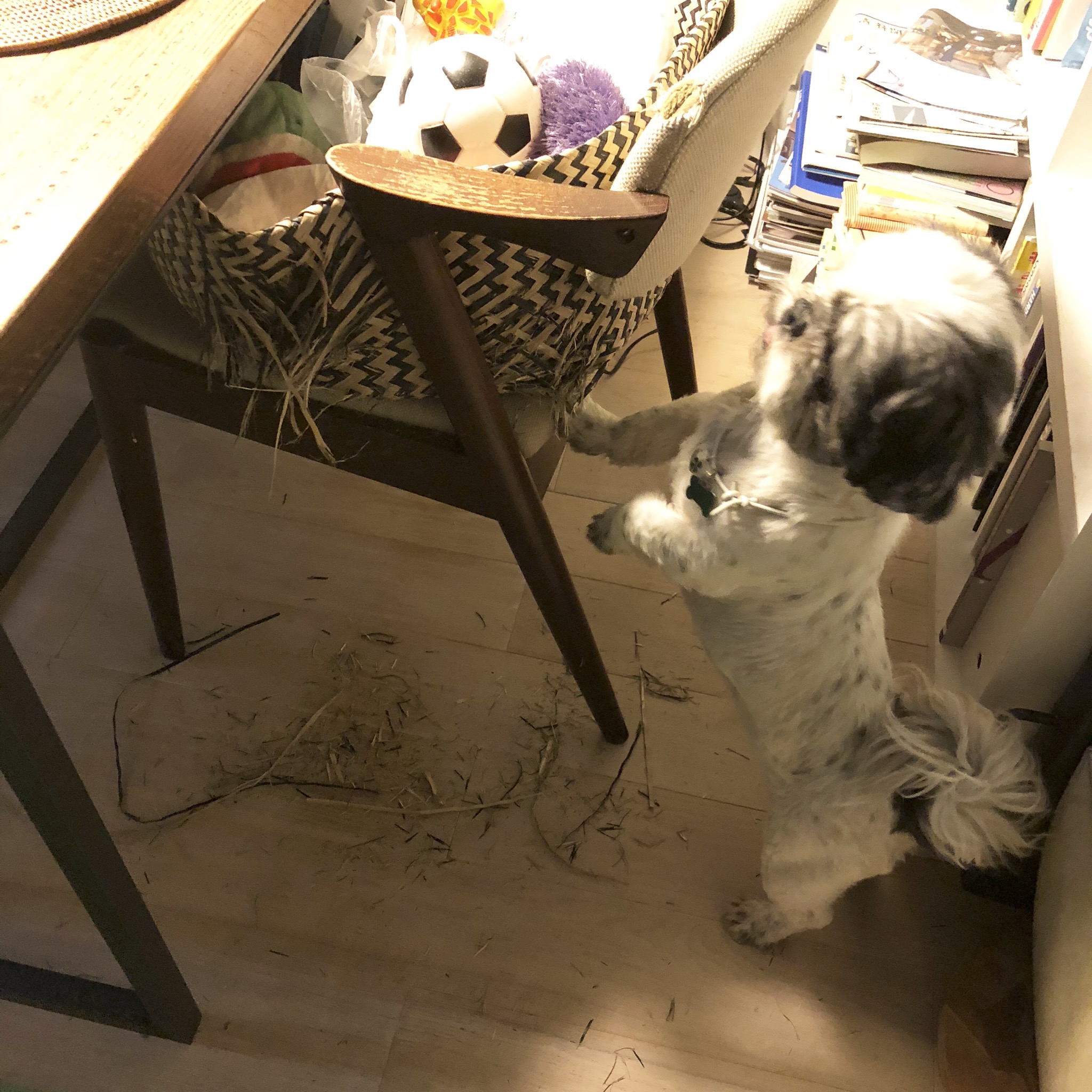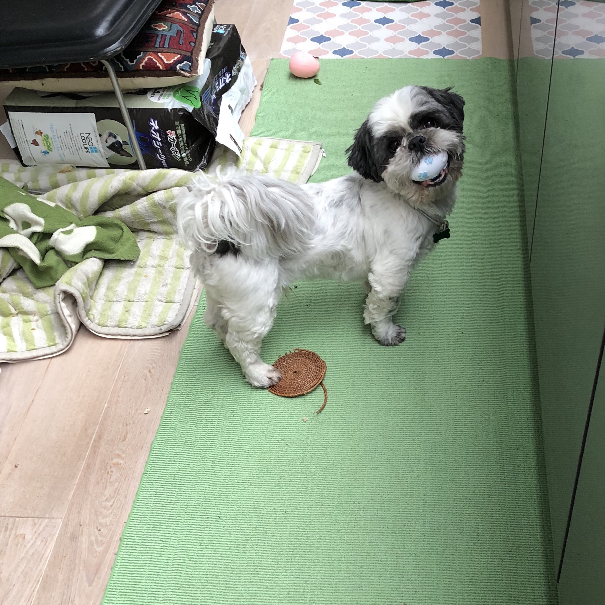 仕事を終えて、 リビングに戻ったら、、、 あ!! 私が棚の上に保存しておいた新品のボールをくわえてる! しかも、ビニールでパッケージされていたはずのボール! (ご支援品) しかも、 踏んでるのは、バリ土産のコースター! ボロボロ! テーブルの上にあったはず。 4つあったコースターは、これで、全て、ソルくんの餌食に(T ^ T) さらに、、、 あ!! なぜ、お気に入りの原画が床に!? 粉砕されたろうそくと多肉植物の葉が散乱! イスに乗り、そこからテーブルに乗るソルくん対策として、 イスに新聞紙をおいて、その上にバランスボールを置いておいたのですが、ダメでした(T ^ T) 先日は、おもちゃの入ったカゴを置いておいたのですが、、、 コラ! カゴがボロボロ〜(T ^ T) やはり、サークルに入れるべし! 現在の犯人 Sol(ソル)はAngel's Taleの保護犬です Sol(太陽)と陽気な暮らし〜★トライアル予定! (仮名・オス・申告6才) 日々の様子 >>>ソル日記