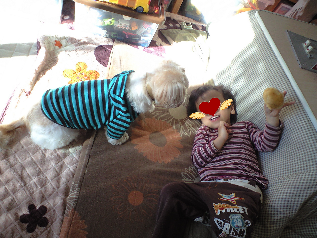 素敵な写真が届いています ![]() S様、毎日、心和む写真とお便り、ありがとうございます ![]() 下のお兄ちゃんの表情をお伝えできなくて残念ですが、なんともいい表情なんです。 ファムくんとのなにげないやりとり…ほんわかした空気を感じます ![]() S様からのお便り 今日はファムくんがじゃれて甘噛みをしてきたので、玩具を見せると反応しました。 (写真は楽しそうに遊んでいるファムくんです。) 投げて遊んで、ひとりで噛み噛みしていると「ピッ!」… とたんにテンションダウンして、玄関に避難していました。 夜も遊んでいて「ピッ!」と鳴らすと、玄関へ… 寒いから〜と部屋に入れても、落ち着きなくウロウロして逃げ場所を探していました。 いつもなら、どんなに子供達が騒いでいても、みんなの真ん中にいて平気で寝ているのに、パニックしているファムくん…可哀想な事をしてしまいました… みんなが静かになってから、ファムくんを毛布にくるんでいつもの座椅子に乗せたら、やっと落ち着いて寝ました。 ファムくん…本当に苦手なんですね…気を付けます… ファムくん、なんのトラウマがあるのか、、 ほんとに「ピッ!」という音が苦手です。 小さく鳴っただけでも、ハウスに逃げていました ![]() 雷よりもキライそう。。。 |