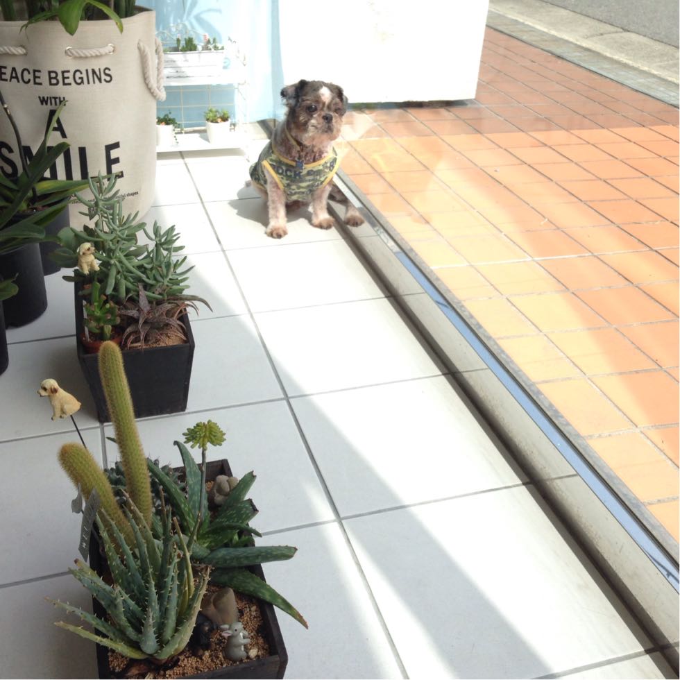 お店のガラス越し、ナッホ君がパワースポット発見すね。