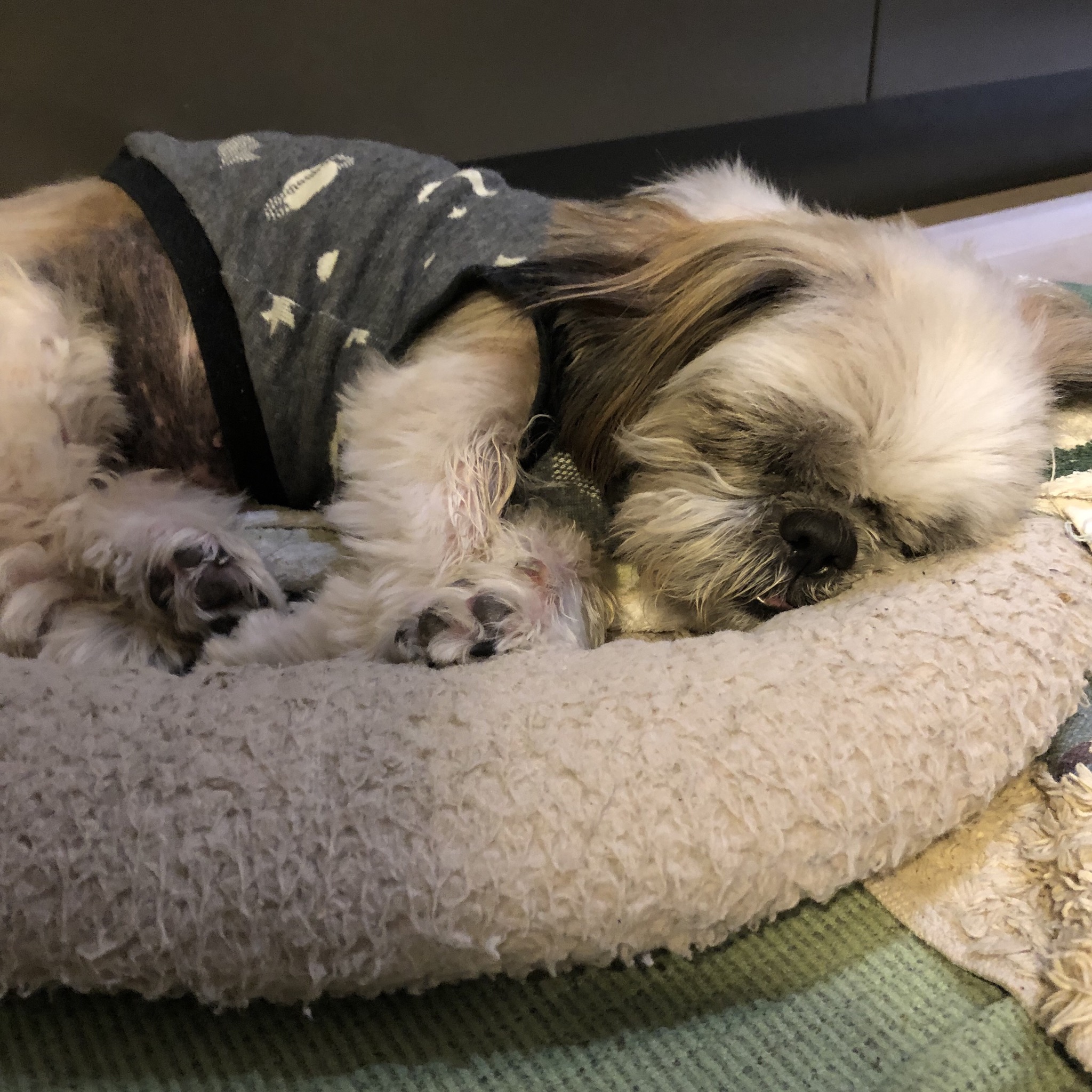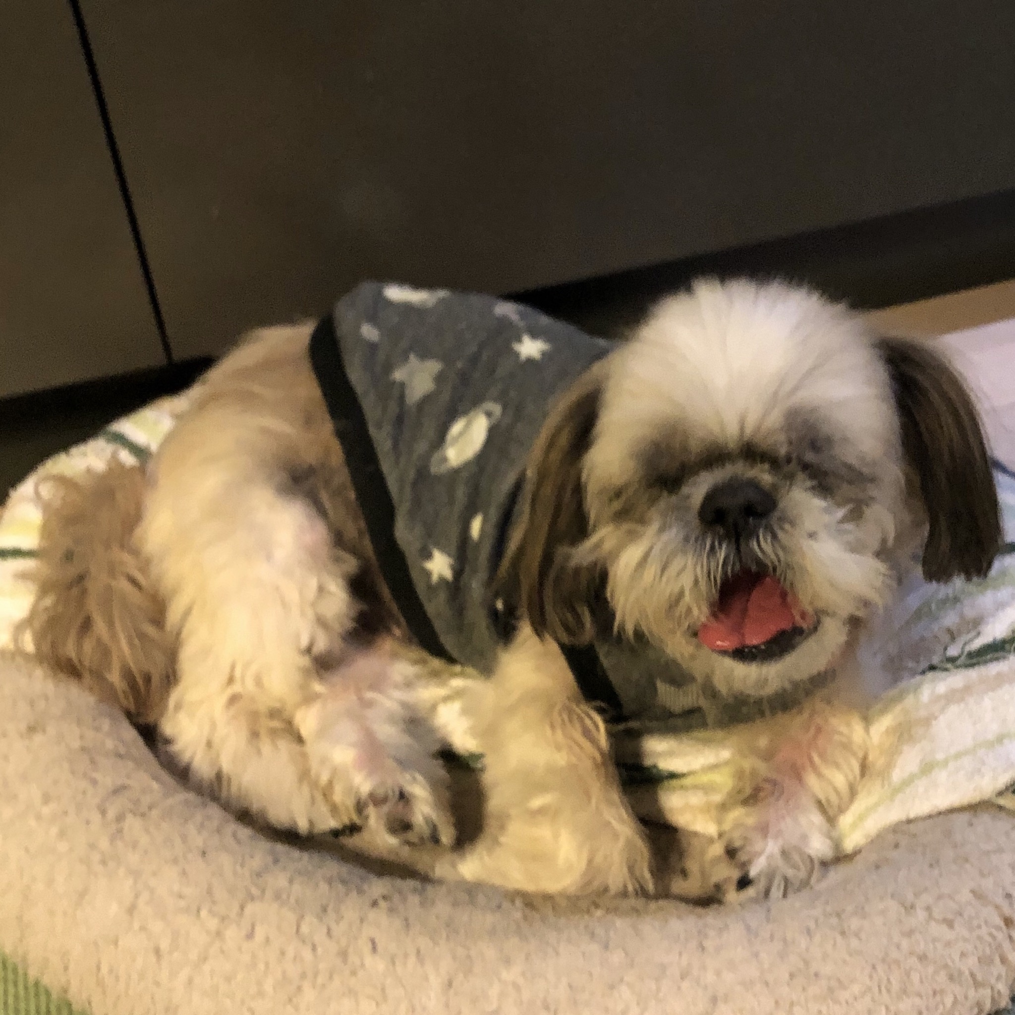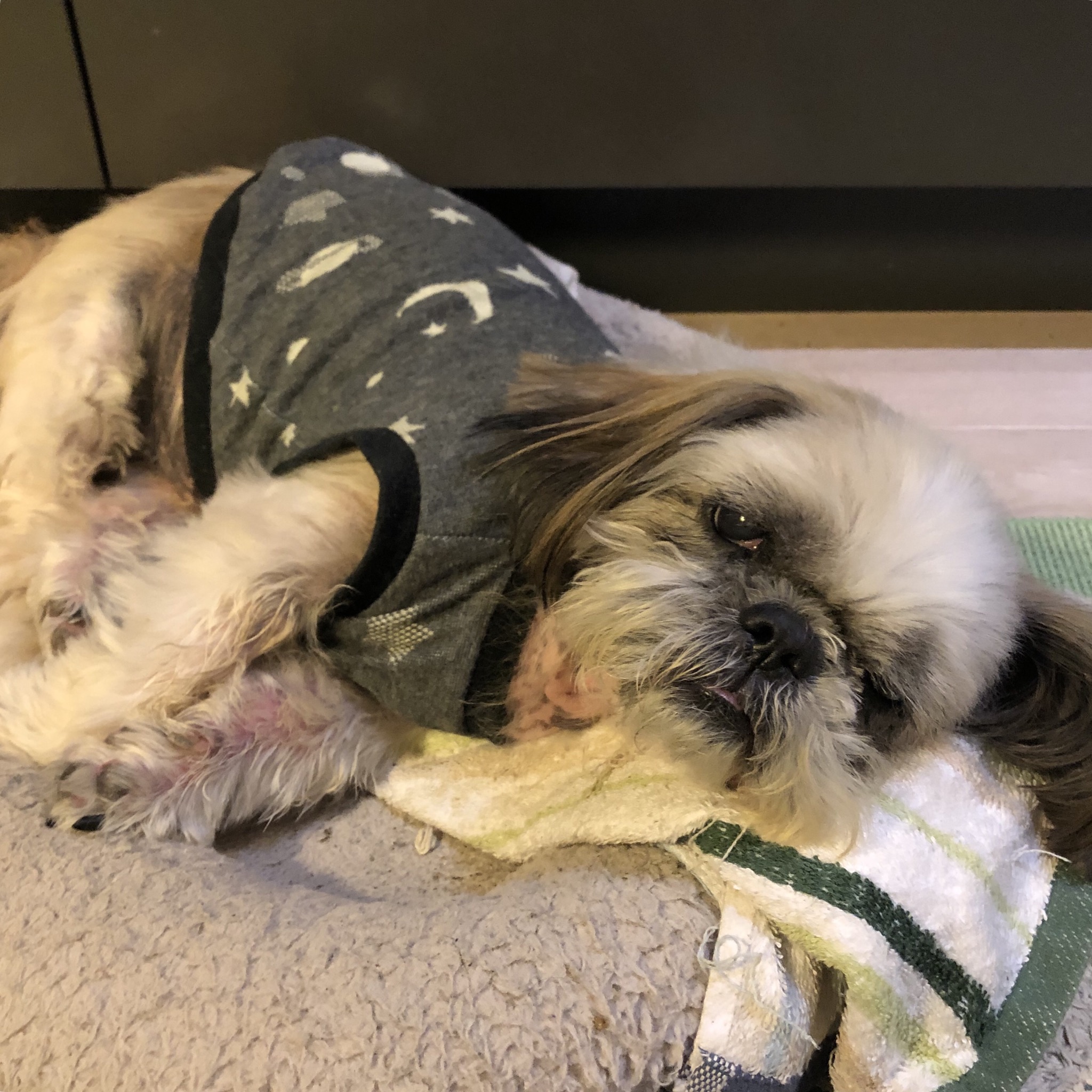 洋服を整理していたら、懐かしの宇宙Tシャツがでてきました! ノフくんに着せていたハナママさんのわんこ服。 ハラミちゃんに着せてみた。 サイズぴったり! 最近のハラミちゃんは、とっても気持ち良さそうによく寝ています! くぉ〜、ぐほ〜と、前はなかった寝息が。 肉付きがよくなったから? 帰ってきても気づいてくれず、 のぞき込んでも、寝息をたてて寝ているので、 番犬にはなりません。 ★ここだけプロフィール★ ポリシー:不満があったらハッキリ伝える ひみつ:時々大きな声で寝言を言う 食事:豪快な食べっぷりと飲みっぷり 引き際:早め 記憶力:高い 好きなフレーズ:わーわーわー 得意な声まね:猫、にわとり 得意な顔まね:研ナオコ 嫌いなこと:目薬 気になること:肉なのか魚なのか 似合う色:さくら色 飼い主になったら出来ること:ギャップ萌え トリビア:実はチョビベロでなくて下唇 テーマ曲:粉雪 有効成分:ブレない女成分ハラミチン配合 ラインスタンプ「ハラミちゃんのきもち」 リリース! ハラミはAngel's Taleの保護犬です ツンデレ系シーズー女子・ハラミ先輩★里親募集中! (仮名・メス・申告12才) 日々の様子 >>>ハラミ日記 ハラミについて>>>プロフィール 保護時の検診>>>代表ブログ 保護時の様子>>>プチステイ先 PR