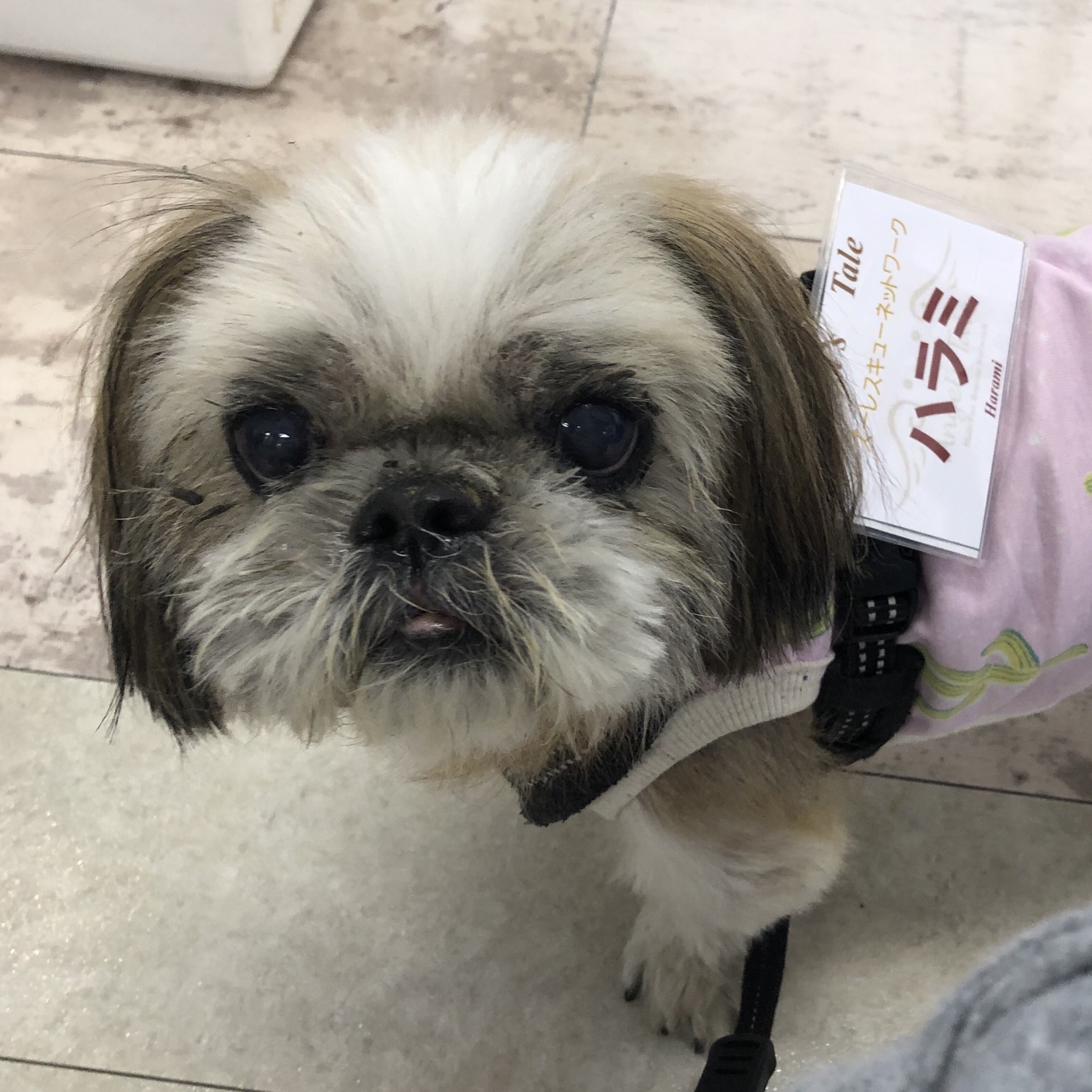 ハラミちゃん、時間限定でしたが、 里親会に参加しました! 行きの電車内。 突如、日吉あたりで、 んーーーー! と叫び出したハラミちゃん。 いつも移動はお利口さんにできるけど、さすがに、いつもより乗車時間が長いと思ったのか、飽きたのか、 不満を訴え始めたので、慌てて、キャリーを肩にかけ全力でなだめました! 引き返すことになるのかと思いつつも、 なんとか到着。 日吉〜日本大通り間、異常に長く感じたなぁ(-_-;) さて、会場では、 すっかり目つきが鋭くなくなったと評判のハラミちゃん♪ この五日間、裸ぐらしのハラミちゃんですが、久しぶりに、届いたばかりのご支援いただいたサボテンTシャツを着て サボテン&ハラミカラー ハ)ところで、オヤツの配布はないわけ? ハ)え?オヤツの無い会? 意味わかんない〜 ハラミちゃん、 ゲストにナデナデしてもらいました♪ ご来場の皆さん、ありがとうございました! 次は、参加した仲間を紹介します♪ ★ここだけプロフィール★ ポリシー:不満があったらハッキリ伝える ひみつ:時々大きな声で寝言を言う 食事:豪快な食べっぷりと飲みっぷり 引き際:早め 記憶力:高い 好きなフレーズ:わーわーわー 得意な声まね:猫、にわとり 得意な顔まね:研ナオコ 嫌いなこと:目薬 気になること:肉なのか魚なのか 似合う色:さくら色 飼い主になったら出来ること:ギャップ萌え トリビア:実はチョビベロでなくて下唇 テーマ曲:粉雪 有効成分:ブレない女成分ハラミチン配合 ラインスタンプ「ハラミちゃんのきもち」 リリース! ハラミはAngel's Taleの保護犬です ツンデレ系シーズー女子・ハラミ先輩★里親募集中! (仮名・メス・申告12才) 日々の様子 >>>ハラミ日記 ハラミについて>>>プロフィール 保護時の検診>>>代表ブログ 保護時の様子>>>プチステイ先 PR