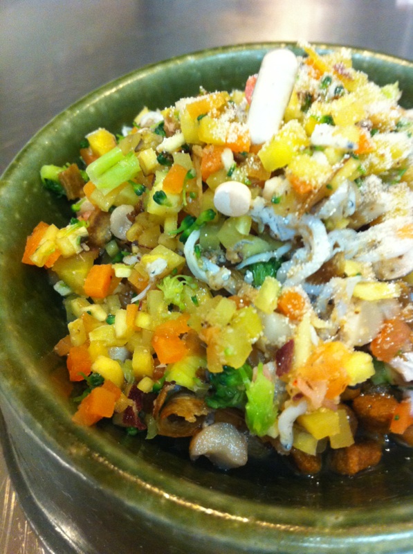 にんじん、ブロッコリー、しめじ、ごぼう、サツマイモのみじん切りに、しらす、すりごま、えびとお水を加えてチンしたものを猫用療法食ヒルズのm/d(大匙2杯分くらい)にかけています。