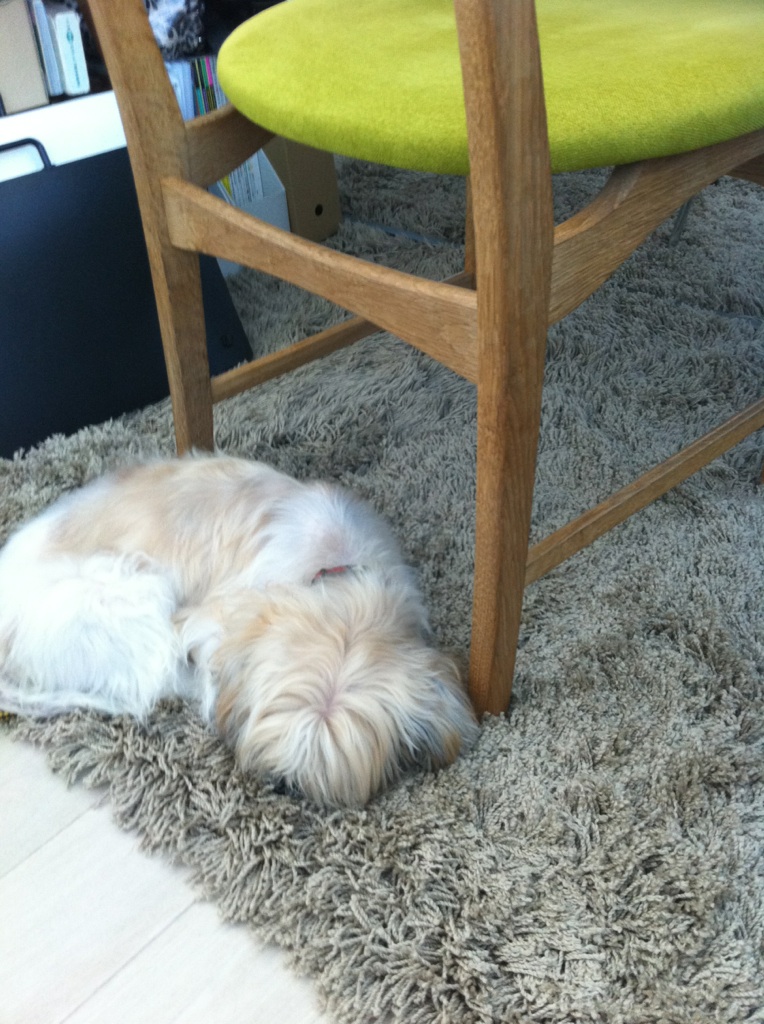 でも、寒かったのか、ようやくラグを出したら、さっそく埋もれて寝ています。