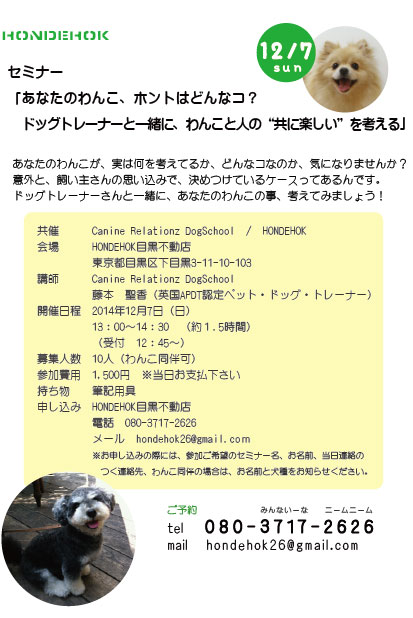 セミナーのご紹介です!! ![]() タイトル 「あなたのわんこ、ホントはどんなコ? ドッグトレーナーと一緒に、わんこと人の“共に楽しい”を考える」 セミナー 我が家のわんこが、実は何を考えてるか、 どんな子なのか、 気になりませんか? 意外と、飼い主さんの思い込みで、決めつけているケースってあるんです。 犬を知ることで、 よりお互いの生活が豊かになること、 犬の魅力が増すこと、 犬たちの可能性の広さを知ること、 につながります! 悪い子だからしつける、、、のではなく、共に楽しいという価値観で、 ドッグトレーナーさんと一緒に、 我が家のわんこの事を、改めて、考えてみましょう。 我が家のわんこ、実は… びっくりすることも、あるかもしれませんね(^з^)-☆ ご参加お待ちしております♪ セミナー情報 ・セミナー「あなたのわんこ、ホントはどんなコ? ドッグトレーナーと一緒に、わんこと人の“共に楽しい”を考える」 ・開催日時:2014年12月7日 1:00〜2:30 (受付 12:45〜) ・場所 :HONDEHOK目黒不動店 目黒区下目黒3-11-10-103 ※ホームページのアクセスサイトよりご確認ください。http://www1.r1.rosenet.jp/hondehok/meguro/megurofudo.html ・募集人数:10名 (わんこ同伴可) ・参加費用:1500円 (当日お支払い下さい) ・申し込み:HONDEHOK目黒不動店 電話 080-3717-2626 メール hondehok26@gmail.com ※お申込みの際は、参加ご希望のセミナー名、お名前、当日につながるご連絡先、わんこ同伴の場合はお名前と犬種をお知らせ下さい。 ・ドッグトレーナー: Canine Relation DogSchool 藤本 聖香 (英国APDT認定ペット・ドッグ・トレーナー) 同日の午前11:00〜12:00 「ドッグトレーナーと行く お散歩練習会」開催! こちらもご参加お待ちしております♪ PR