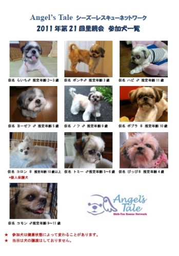 今日も、保護犬ノフは元気に過ごしています。 サクサクお散歩。 見てください、この目ヂカラ! 常に強気(^_^;) 病気に倒れる気配ありません! まだ、里親会前の最後の難関、シャンプーandトリミングが残っています。 無事を祈る (`_´)ゞ もちろん、私の… にほんブログ村 8月27日(土)は、 シーズー保護団体 Angel's Tale の里親会です。 保護犬ノフも参加します。 保護犬達に会いたい方、ボランティアに興味のある方等、是非、遊びに来てください! 開催場所 しっぽ倶楽部 ユトリーヌ (最寄駅:田園都市線 鷺沼駅) 開催時間 11:00~14:00 参加犬達! ノフは不動のセンター! (偶然に決まってますけど…) ▼クリックで拡大 ▼クリックで拡大 PR