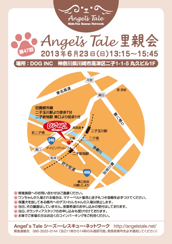 シニア犬がテーマのフリーマガジン 「ぐらんわん」最新号にて、 やまちゃん里親様のぺろままさんが紹介されています! 殺処分ゼロに向けての想い。 その一端であるバッジを先日の里親会で配らせて頂きました。 月末の里親会でもお配りできると思います♪ そして早くも、 27日土曜日は、成増にて里親会が! 成増駅(北口)から徒歩5分くらい。 有楽町線 地下鉄成増駅(5番出口)からも来れます。 ※里親会会場(ドッグラン)の様子→▽・x・▽ ※徒歩の場合は、上記マップルートの他に、成増図書館の入ってるビルを反時計回りするルートもおすすめです。 北口を出て、西友沿いの大きな階段を下ったら、少し行くとあるもうひとつの小さい階段を下り、成増図書館の入ってるビル(1階にサンクスなど)沿いを進むと、横断歩道の正面に一階は美容室二階はヨガのビルがあります(セブンイレブン並び)。その前を通り右折。坂を下ったところに金太郎マークのもしもしはいはいの看板があります。そのとなりです。 ムトもはりきって参加予定☆彡 ![]() PR