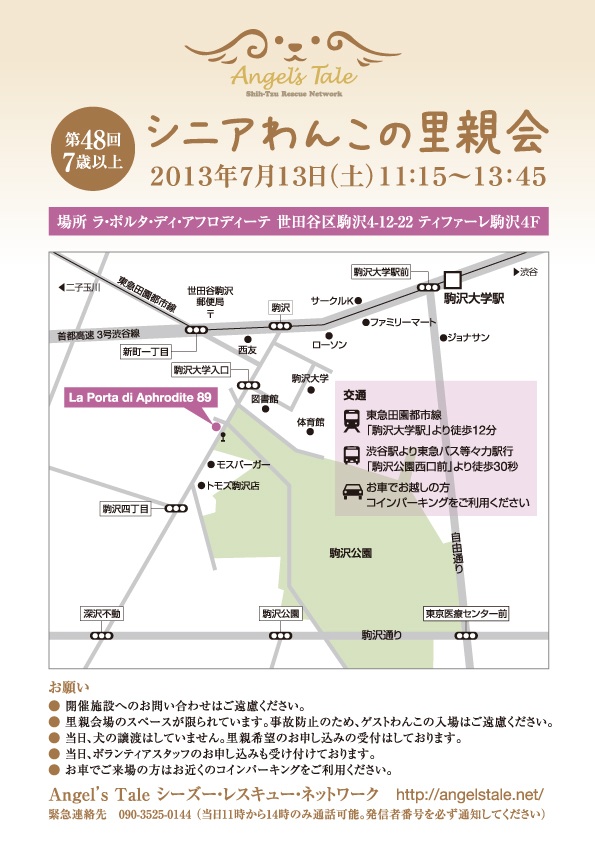 今度の土曜日は、シニアわんこ限定里親会です! 駒沢公園付近にある癒しの空間「アフロディーテ」にて開催。 会場までの最短ルートは、 駒沢公園駅 駒沢公園口→246→駒沢公園通り→アフロディーテ (反時計回り) ですが、 今日は、ちょっと寄り道で駒沢公園を味わえるコースをご紹介します。 (時計回り) マップのいちばん左下が、会場のアフロディーテです。 より大きな地図で アフロディーテと駒沢公園よりみちルート を表示 << ちょっと寄り道で駒沢公園を味わえるコース(時計回り) >> ★駒沢公園駅 東口 ↓ ★駅直結のわんこOKカフェ 「トーキョーピープルズカフェ」 室内外ともわんこOK。わんこメニュー、おやつ販売しています。 一人でも入りやすいし、スタッフが親切で気に入ってます♪ 東京都民銀行と併設。 ↓ 自由通りへ ↓ 良さそうなレストランや、 普通の公園沿いに歩いて行くと、 駒沢公園の入口 「駒沢大学駅方面(最寄り)口」から駒沢公園へ ↓ 駒沢公園の中を歩いて 「駒沢公園西口」へ 大きい並木に癒されます ↓ 「駒沢公園西口」を出ると、駒沢公園通りです。 そばにある横断歩道を渡ると、アフロディーテが4階に入っているビルです! 里親会会場「La Porta di Aphrodite 89」 ティファーレ駒沢4階 ※1階はレストラン、2階はカフェ「IZM」(わんこOK) ↓ 帰り道は、、 駒沢公園通りを246方面へ(北上) ↓ フレッシュネスバーガー 室内外ともわんこOKカフェです。 駒沢公園の西口を望みながら、オープンエアで一息つきましょう。 ↓ 駒沢公園通りから246へ ↓ 駒沢大学駅 駒沢公園口 どうですか? ますます、シニア限定里親会が楽しみになったでしょうか? 里親会の会場へはわんちゃんをお連れ頂けないのが残念ですが、 わんちゃんと駒沢公園へ遊びにくる下見ということで、チェックしてみてくださいね~! ★シニアわんこ限定里親会★ お騒がせヤングなムトは、泣く泣くお留守番です。 ![]()