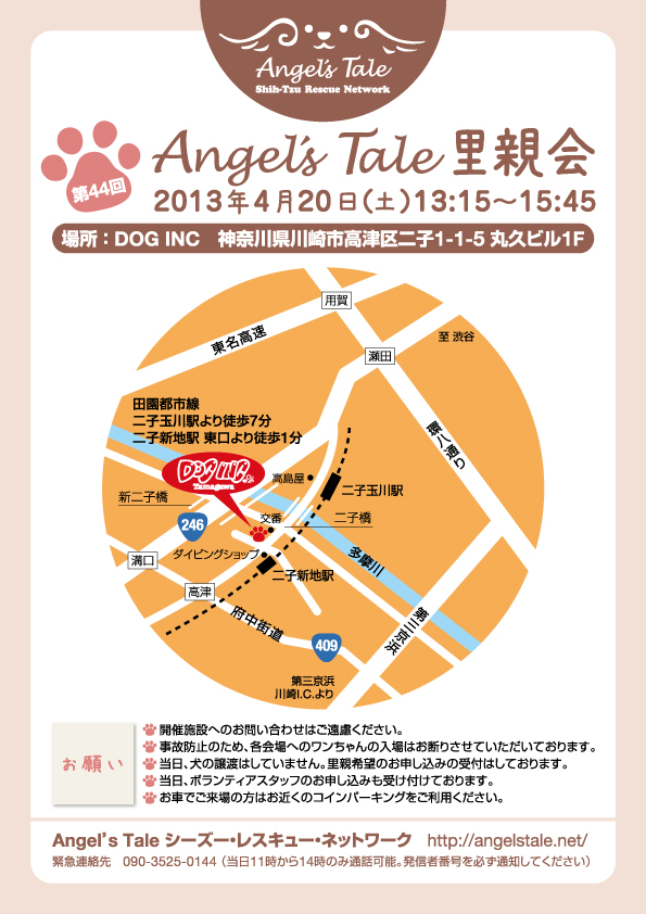 今週末の土曜日は、 エンジェルズ・テイルの里親会です ![]() 参加犬は、上記のシーズー達の他に、 ごまちゃんも来れることになりましたよ ![]() 今回も、ハナママのわんこ 服の販売、アモコトラ の物販では、質が良くてセンスが光る服や、きのこのおもちゃ を購入できます![]() エンジェルズ・テイルのオリジナルお散歩バックもよろしく ![]() グリーン・オレンジ・ブルーがあります(写真はグリーン) 先日のムトのトライアル開始のお届けの際に持参した シリコン製のトイレマットがあるのですが、 mameazuさんが、とても気に入ってくれました! 里親会でお渡しすることになっていますが、 余分に1つあるので、もし、私も欲っし~!という方は会場でパピに声をかけてください。 もちろん、売上の利益分は会に寄付します。 イベント詳細はこちらをご覧ください>>> 日時:2013年2月16日(土) 時間:13:15~15:45 場所:DOG INC 住所:神奈川県川崎市高津区二子1-1-5 丸久ビル1F ◎雨天決行