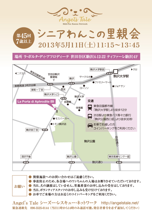 エンジェルズ・テイル初! シニア限定の里親会があります ![]() ドッグ・フレンドリーな駒沢公園の新会場。駒沢公園の緑 を望む癒しの空間です![]() 7歳以上のシニアわんこが、皆様をお待ちしております。 会場を提供してくださるアフロディーテのサイトでも イベント告知をしてくださいました。 こちら 里親会開催についての想いもつづられています。 こうした、いろんな方の想いに支えられて毎回の里親会があるのだと、改めて感謝いたします。 ワンポイント![]() 駒沢大学駅から歩いていくと、フレッシュネスバーガー のちょっと先にあります。1階は、イタリアンレストラン 「トゥ セイ グランデ」2階は、犬もオッケーのカフェ 「IZM」会場「ラ・ポルタ・ディ・アフロディーテ89」は4階です。 PR