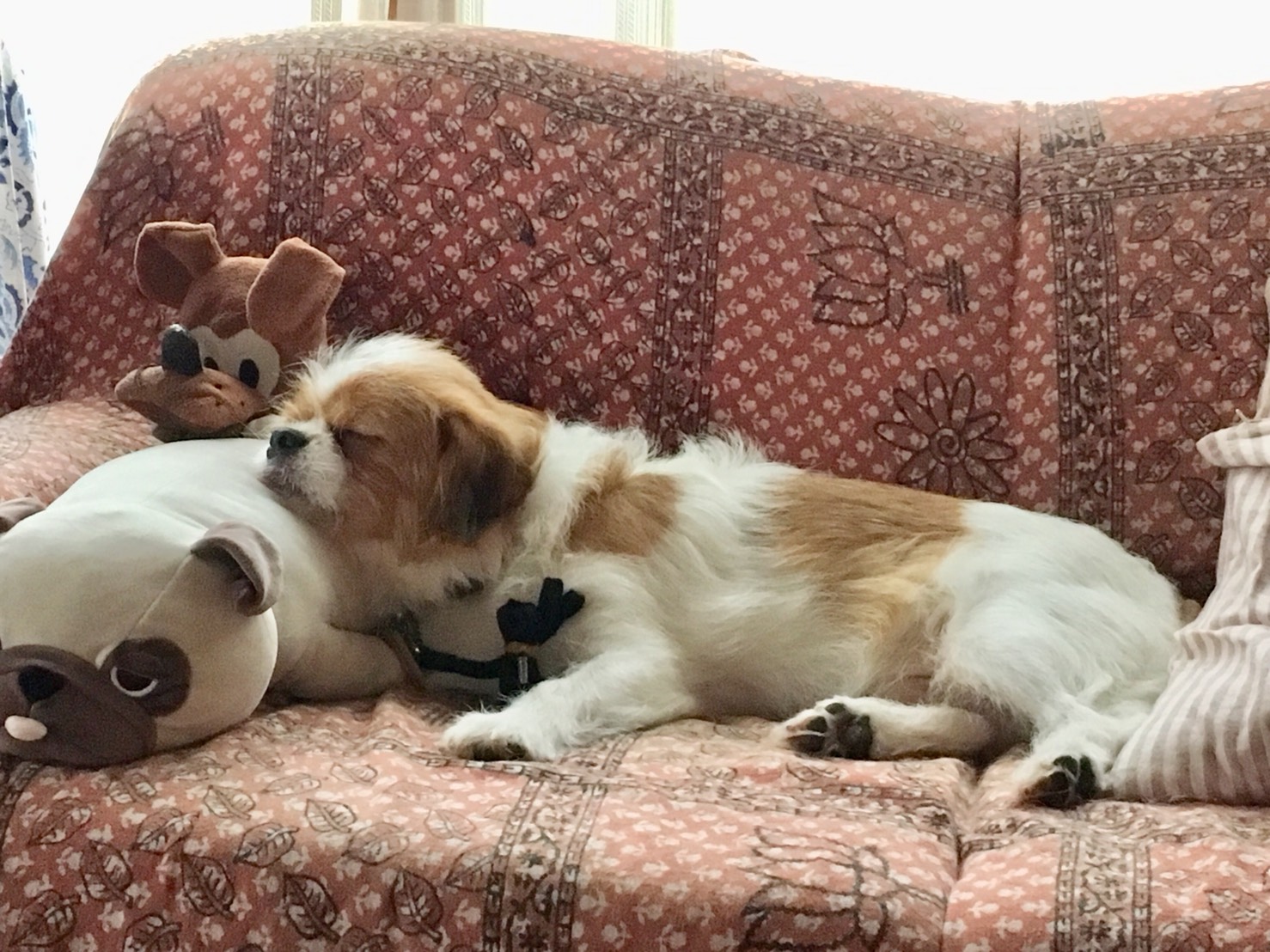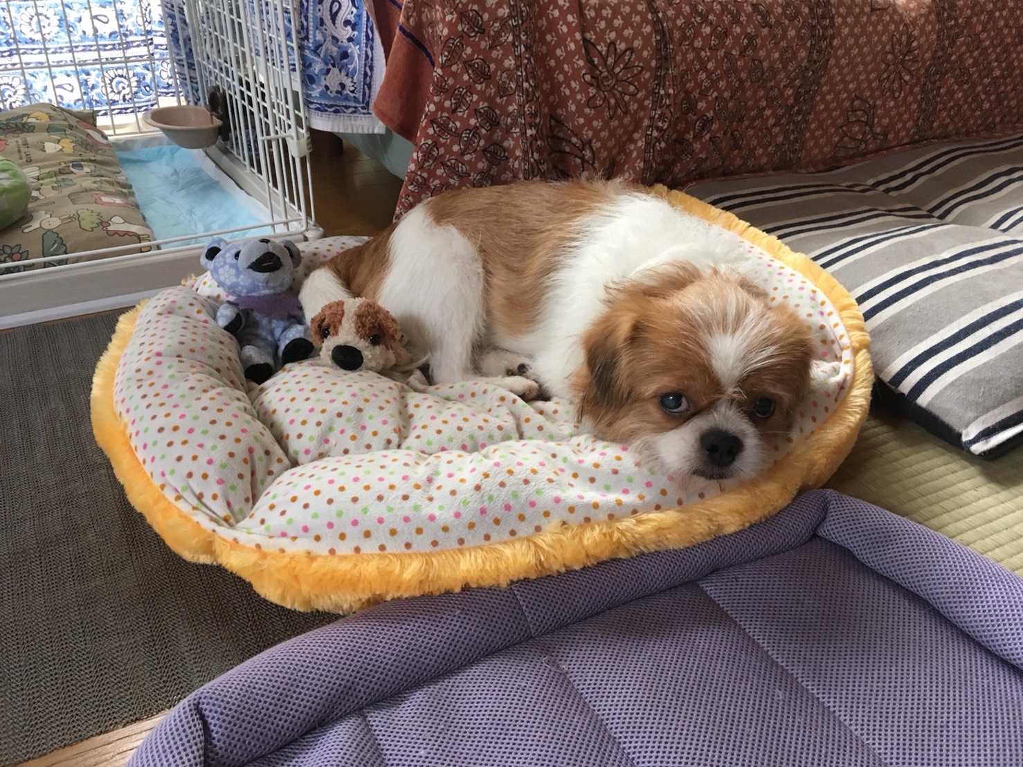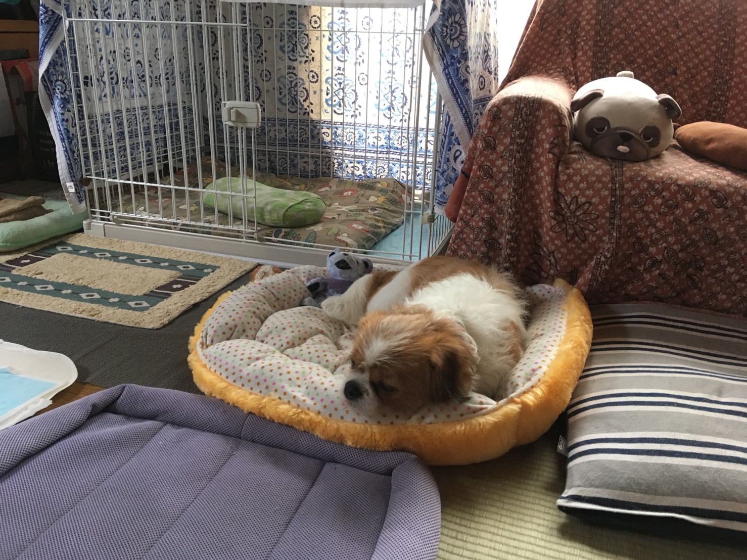 ☆T様からのお便り パピさまからいただいたベッドはやはり一番落ち着く場所らしく、ハウスの外でも安心した様子でスヤスヤ眠っています。 二階で家事を済ませ、リビングに戻ると、(パグ先輩)がモーイくんのベッドにいて、モーイくんはすぐそばで横になっていました。モーイくん、ベッドを貸してあげたのね。優しくしてくれてありがとうね♡ 先程、某保護団体さんのブログで、モーイくんと同じ場所からレスキューされ、7月に正式譲渡されたワンコが、8月22日に逸走してしまったという記事を目にしました。※ すでに2週間以上が経過しています。どうか、その子が無事に飼い主さんの元に戻れますように!切に切に願うばかりです。 (※ すでに見つかったそうです!) (パグ先輩)を抱っこして外トイレに連れて行く度に「何処に行くの?」という表情で玄関近くまでついてくるモーイくん。あらゆる可能性を考え、油断せず、念には念を入れ脱走対策に気をつけなければと、あらためて肝に命じています。 モーイはAngel's Taleの保護犬です フロム ネイチャー・モーイ★トライアル中 (仮名・オス・推定4才) 日々の様子 >>>モーイ日記 モーイについて>>>プロフィール
