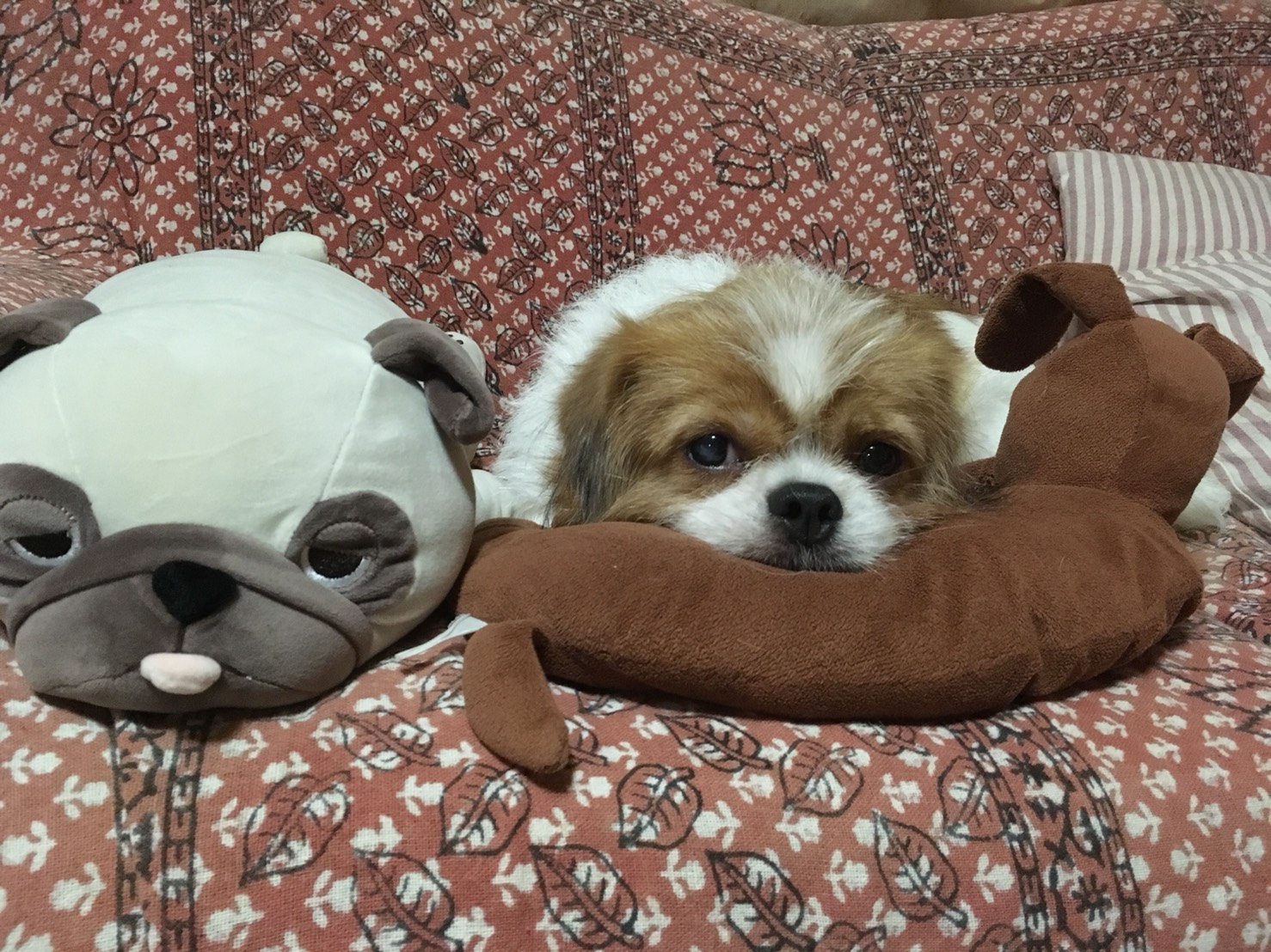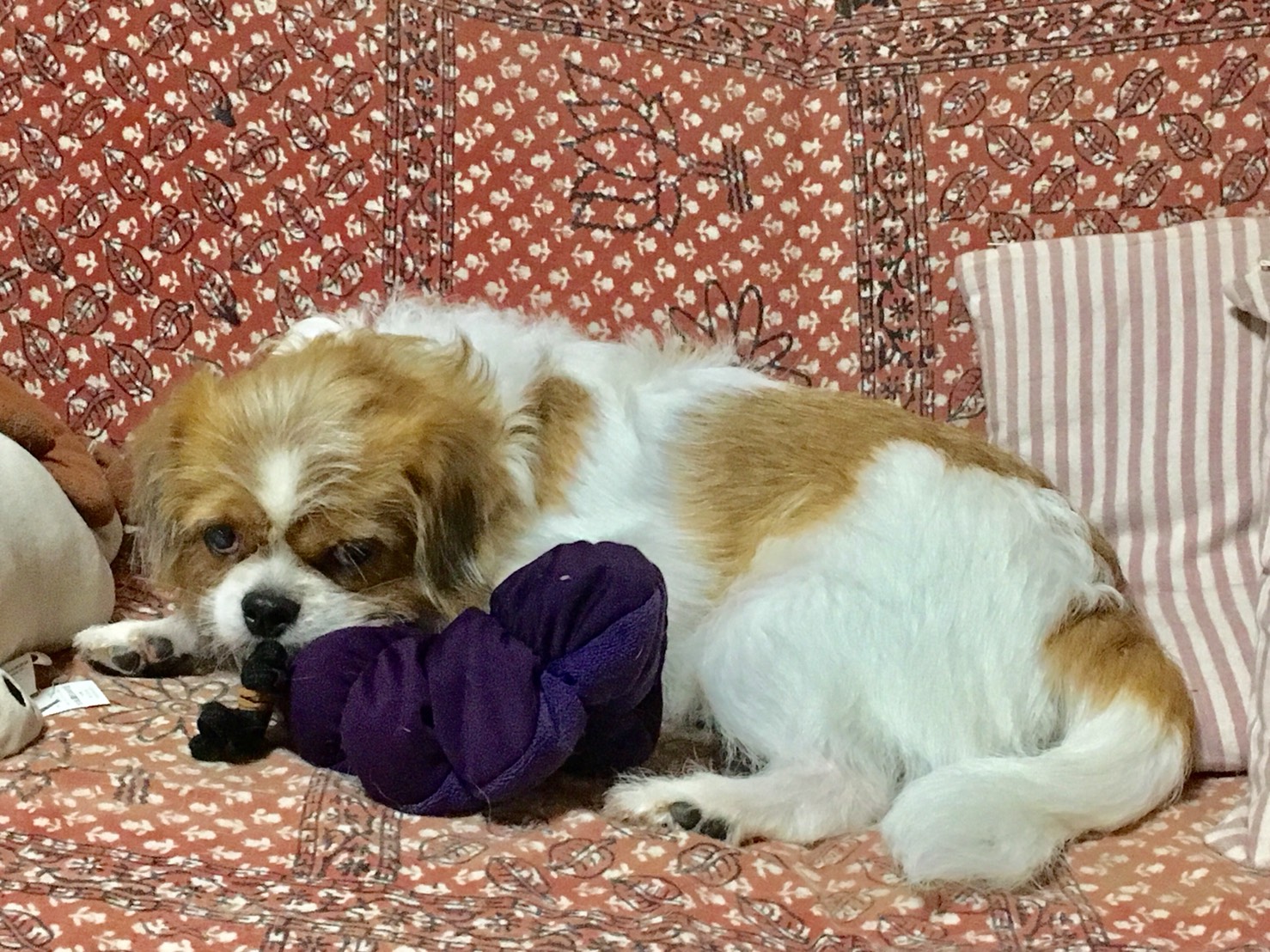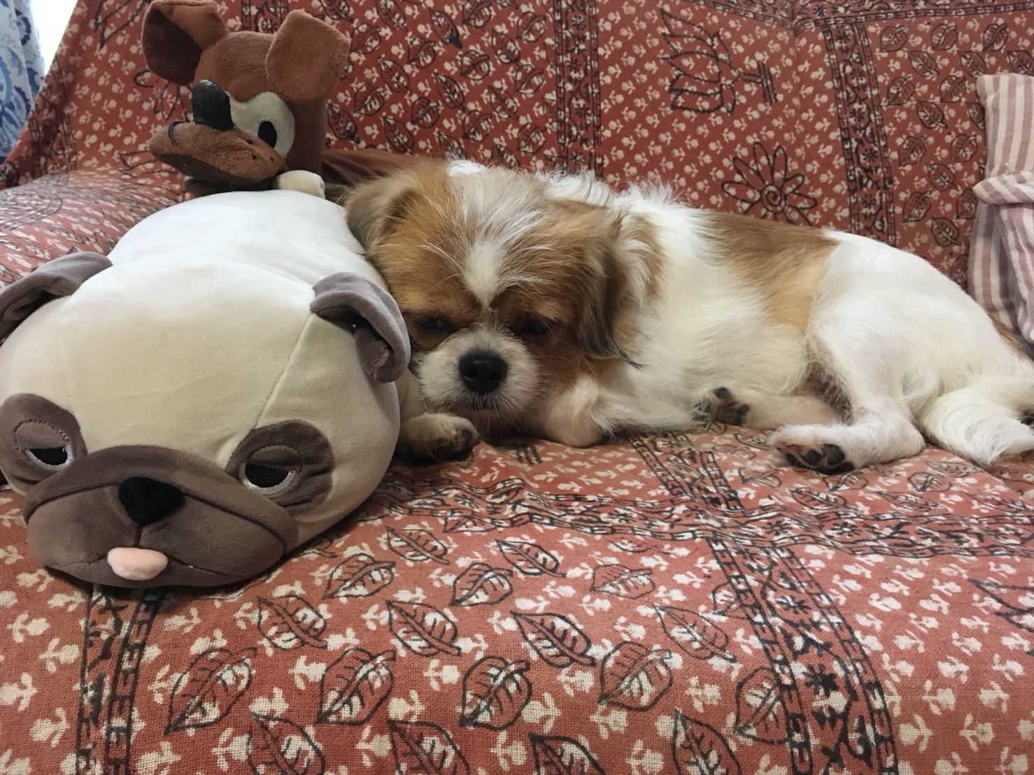☆T様からのお便り トライアルも後半となり、運動量も少しずつ増えてきました。洗面所までついてきてはダッシュで戻ったり、部屋の中を小走りしたり「ハウス」の誘導などで、オヤツの回数も増えているので、試しに(パグ先輩)の好物の「茹でキャベツの芯」をあげてみたら、シャクシャクと美味しそうに食べていました。 今日はちょっと残念な事もありました。 パピさまが持たせてくださった、もいくんjr.をハムハムしている時に「カリッ」と⁈ あわてて確認したら、お目目が根元からポキっと折れていました。モーイくんの野生を垣間見た瞬間でした。もいくんjr.には応急処置を施しておきましたが、ボタンやカミカミしそうな物には要注意ですね。 自分からそばに来ては、夫や私の手にそっとタッチをしてくる事があります。「オテをしたから、オヤツをちょうだい。」と言っているのかな?ハロウィンの可愛いオバケちゃんのようなモーイくんです。 ϵ( 'Θ' )϶ パピコメ ϵ( 'Θ' )϶ ふわふわの場所がいくつもある楽園で、おもちゃで遊ぼうとしたり、はじめてのオヤツをもらったり、おねだりしたり、、、 すっかり家庭犬!満喫してますね♡ モーイはAngel's Taleの保護犬です フロム ネイチャー・モーイ★トライアル中 (仮名・オス・推定4才) 日々の様子 >>>モーイ日記 モーイについて>>>プロフィール