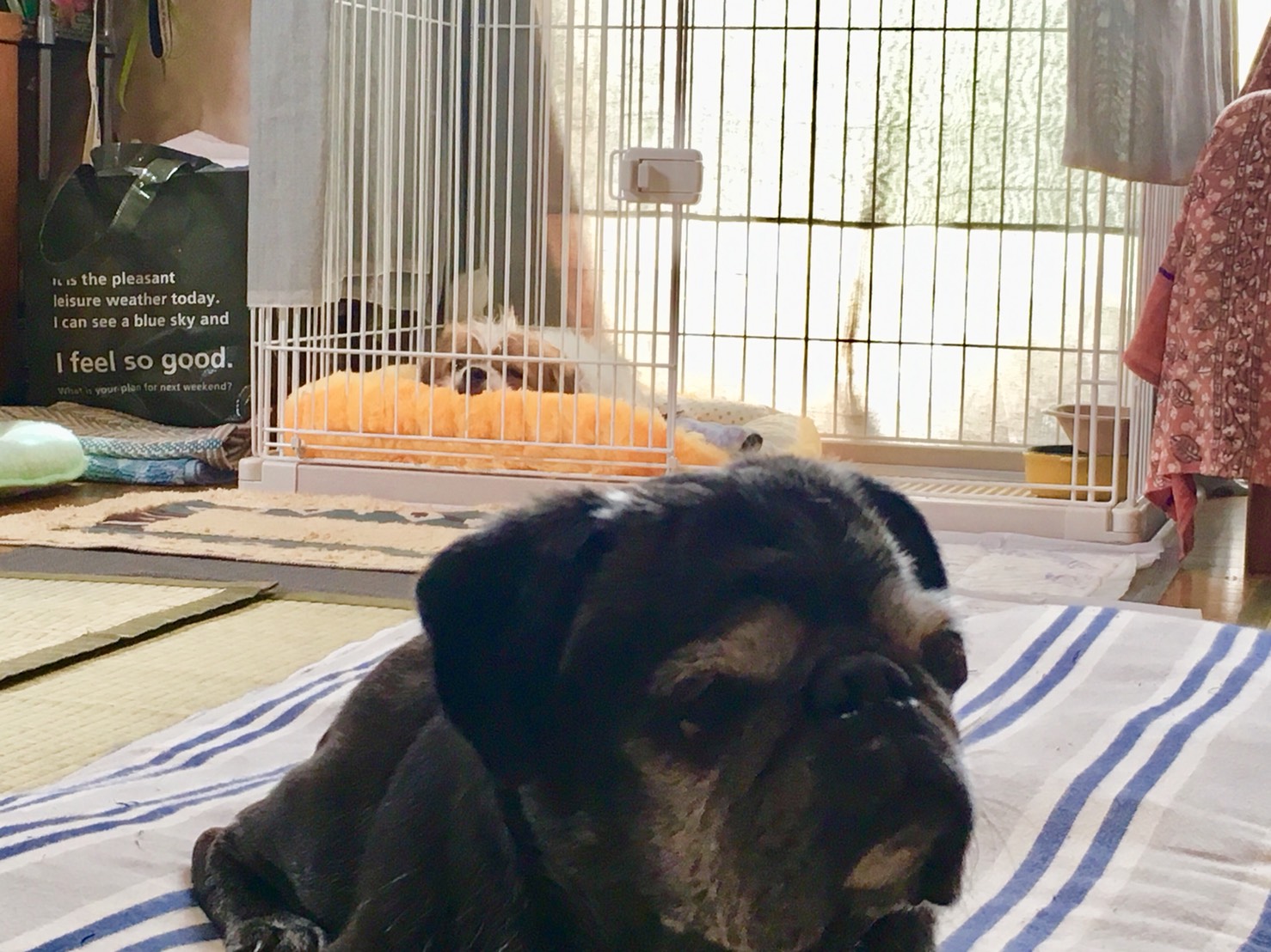 ダンクくん&ちゃん太くん、陽六くんと時を同じくして、モーイくんもトライアルスタートしました! 出発して、すぐ、やはり怖かったようで脱糞してしまい、しかも道中ちょっとチッコもしてしまったようで、汚れながらの到着。 先住犬の〇〇〇くん(パグ先輩と呼ばせてもらいます)が、テクテクと登場し出迎えてくれました♪ さっそく、モーイくんの様子や、写真、動画をいただいています! (抜粋) モーイ君はベッドでしばらく横になっては、時々ハウスから出て、リビングのあちこちをパトロールしています。歴代のワンコ達の気配を感じて確認しているのかもしれませんね。 1時ごろに洗い物をしていたらキッチンの横に来たので、フードを半分あげてみました。最初は一粒づつゆっくり食べて、そのあとは一気に完食しました。今はリビングでゴロゴロ横になっている夫や私や私の足の間にいる(パグ先輩)の近くに偵察に来たりしています。ベッドで横になり目を閉じていても呼吸が速いので、リラックスして眠れるにはまだ少し時間がかかるかな? (パグ先輩)はいつのまにか熟睡していて、モーイ君のペースは和が家の(パグ先輩)にはとても合っていると感じます。 モーイ君の仕草の一つ一つが可愛くて仕方ありません。パピさん、今までモーイ君にたくさんの愛情を注いでいただき、本当にありがとうございました。今日は朝からお疲れになったと思いますので、まずはゆっくりお休み下さいね。 用意してもらったサークルを陣地にして、度々、部屋を偵察できているようです。 思ったより、自然にすごせてます。 追って、いただいた動画もアップしますよ! お見合いに続き、同行してくれたDaiKo3、ありがとうございました! モーイくん、幸せつかんでね! モーイはAngel's Taleの保護犬です フロム ネイチャー・モーイ★トライアル中 (仮名・オス・推定4才) 日々の様子 >>>モーイ日記 モーイについて>>>プロフィール