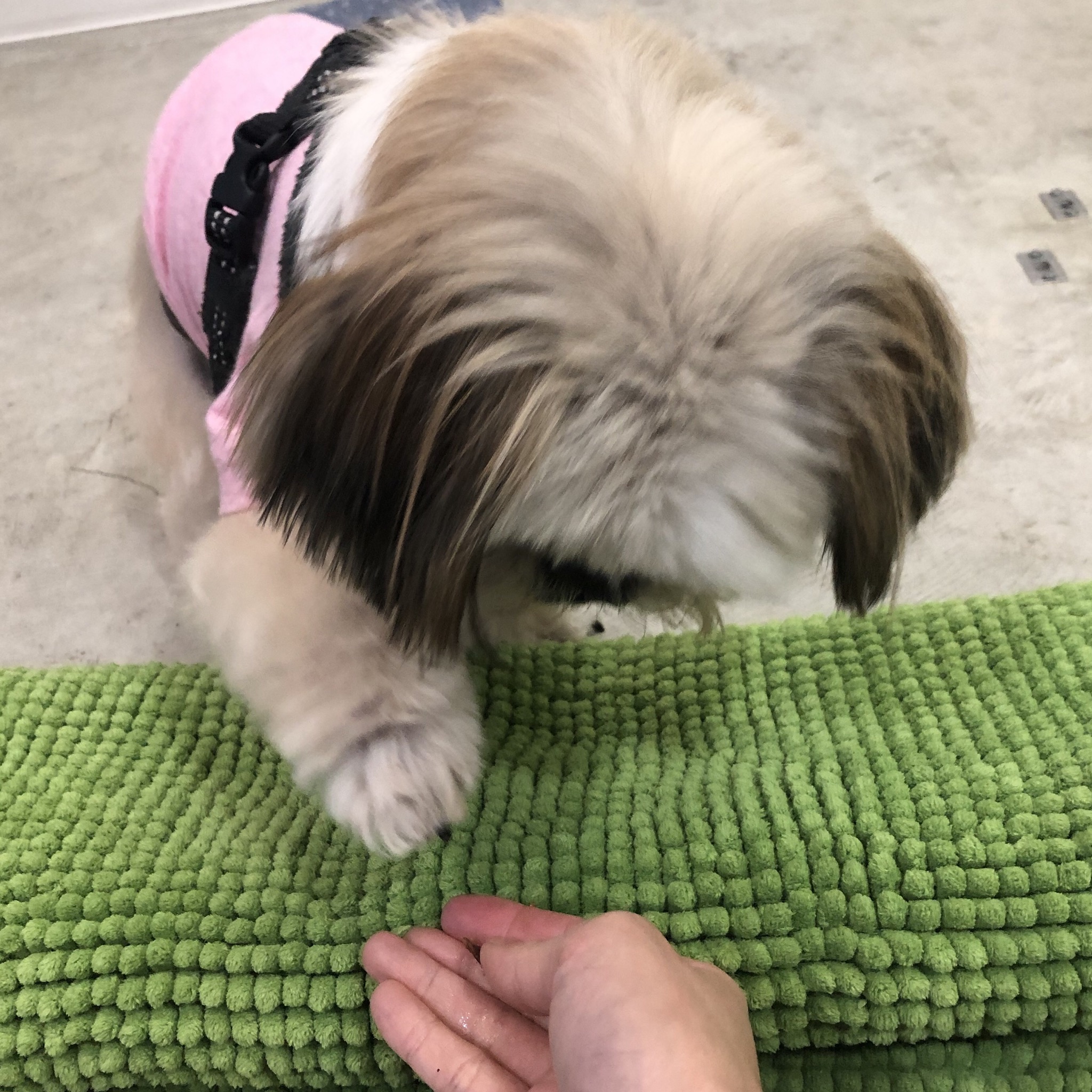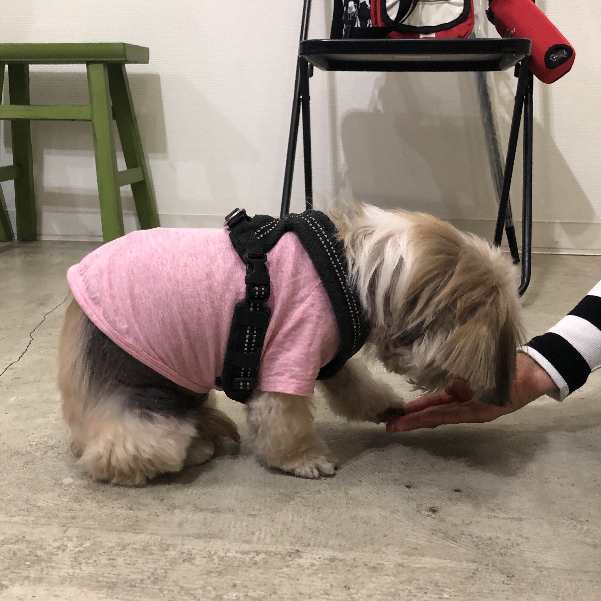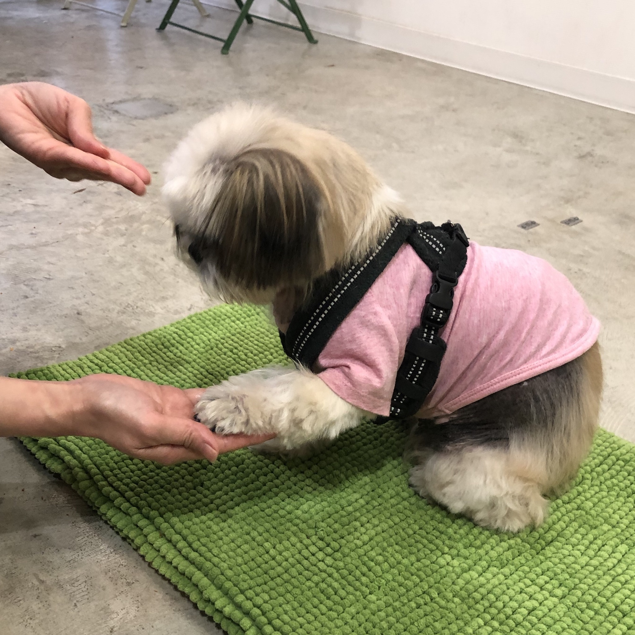 朝ごはん抜きで、病院へゴー! 注射をして一時間の待機となり、公園へ。 安静にね。 でも、時々、腹ペコを思い出す(^-^; すねて、足をカジカジ。 帰宅後シャンプーして、グループレッスンへ! オスワリはマスターしたので、新技に挑戦! 家で、オテを練習した時は、 何で食べづらいトコにオヤツだすの!?( *`ω´) と、ワナワナしていたのですが、 みるみるステップアップ! 足をずらすだけから、徐々に、マットの上に乗せるように。 マットの厚みを増やしていって、 手の上にもタッチできるように! 今はどっちの手を出してもオッケーな甘め設定ですが、 すっかりオテできてるハラミちゃん! 他の飼い主さんにも、オテしてる♪ ひと技習得したGWとなりました♪ ★ここだけプロフィール★ ポリシー:不満があったらハッキリ伝える ひみつ:時々大きな声で寝言を言う 食事:豪快な食べっぷりと飲みっぷり 引き際:早め 記憶力:高い 好きなフレーズ:わーわーわー 得意な声まね:猫、にわとり 得意な顔まね:研ナオコ 嫌いなこと:目薬 気になること:肉なのか魚なのか 似合う色:さくら色 飼い主になったら出来ること:ギャップ萌え トリビア:実はチョビベロでなくて下唇 テーマ曲:粉雪 有効成分:ブレない女成分ハラミチン配合 ラインスタンプ「ハラミちゃんのきもち」 リリース! ハラミはAngel's Taleの保護犬です ツンデレ系シーズー女子・ハラミ先輩★里親募集中! (仮名・メス・申告12才) 日々の様子 >>>ハラミ日記 ハラミについて>>>プロフィール 保護時の検診>>>代表ブログ 保護時の様子>>>プチステイ先