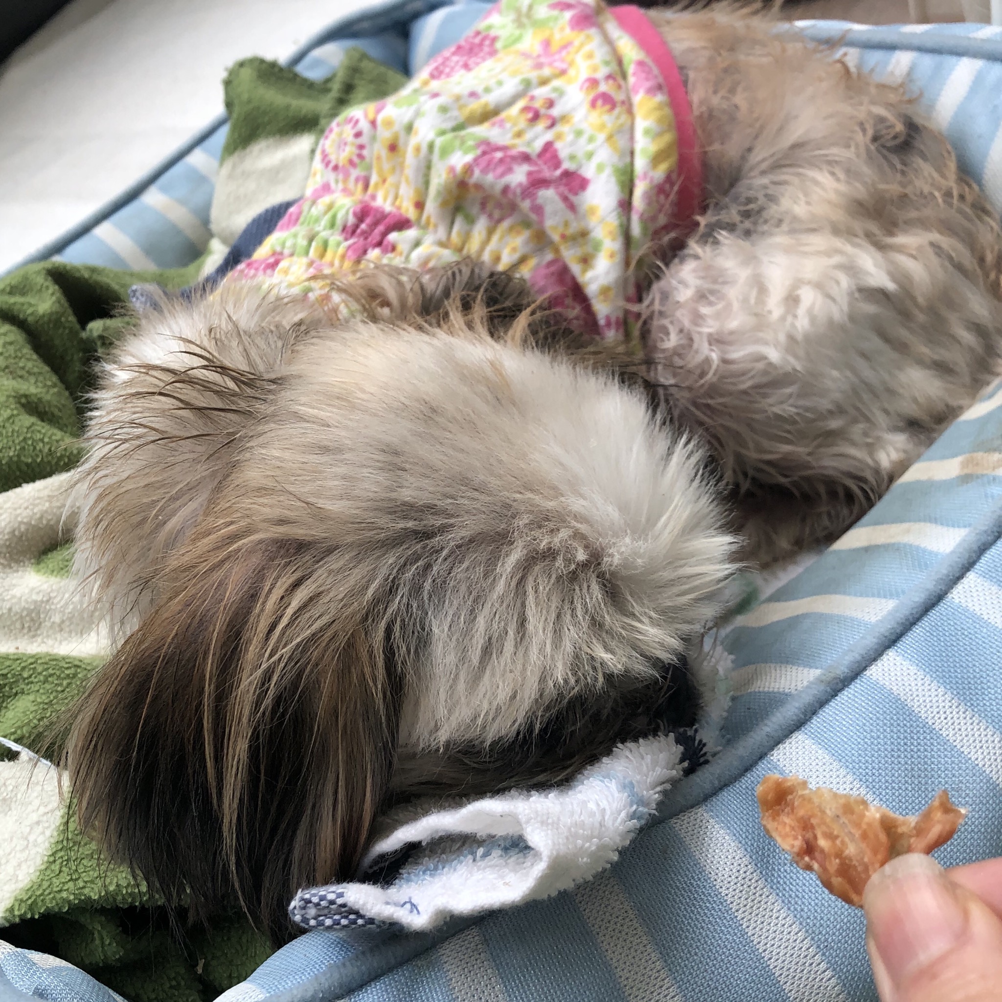 朝のお散歩後、ジェルを塗った前足をみたら、 腫れがだいぶ引いていました! 前は、大きな肉球と真ん中の肉球の間に隙間は無く、腫れのせいでピッタリくっついていました。 撮った肉球の写真を何度も眺めるなんて、 変な人だなと自分で思うけど、 嬉しいし励みになります♪ 今日は3日連続のお出かけの予定だったのですが、 一切起きてくれません。 オヤツを差し出しても起きないなんて、 よっぽど出掛けたくないようなので、 断念しました(-。-; はらさん、無理言って、すみませんでした〜 ★ここだけプロフィール★ ポリシー:不満があったらハッキリ伝える ひみつ:時々大きな声で寝言を言う 食事:豪快な食べっぷりと飲みっぷり 引き際:早め 記憶力:高い 好きなフレーズ:わーわーわー 得意な声まね:猫、にわとり 得意な顔まね:研ナオコ 嫌いなこと:目薬 気になること:肉なのか魚なのか 似合う色:さくら色 飼い主になったら出来ること:ギャップ萌え トリビア:実はチョビベロでなくて下唇 テーマ曲:粉雪 ハラミはAngel's Taleの保護犬です ツンデレ系シーズー女子・ハラミ先輩★里親募集中! (仮名・メス・申告11才) 日々の様子 >>>ハラミ日記 ハラミについて>>>プロフィール 保護時の検診>>>代表ブログ 保護時の様子>>>プチステイ先