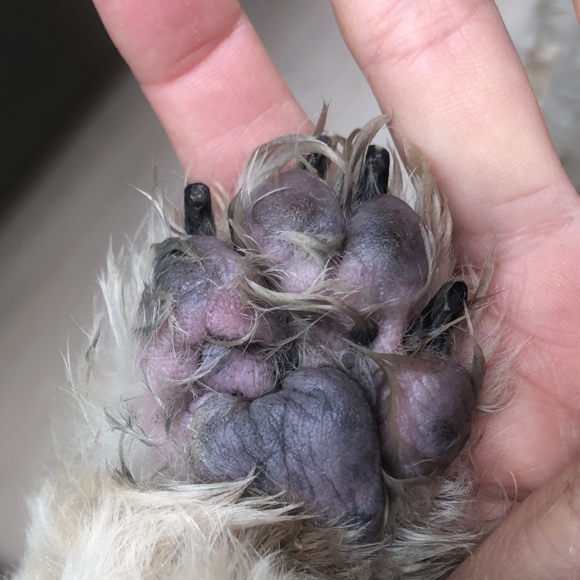 今日も洗われ、お怒りのはらちゃん。 相変わらず、調子いいとは言えない状況ですが、 その中では、まあまあかなぁ。 だいぶ薄毛になりました。 脂臭が強かったはらちゃんの今日のメニュー アニマー湯 マラセブシャンプー アフロートモイスチャライズ 掛け流し アフロート モイスチャライズフォーム (タオルドライ後) マイクロシン Wスキンケア (タオルドライ後赤みのある足の部分に) Agイオンイヤークリーナー どんなに低刺激でも、何らかのシャンプー剤を使うと皮が大きくむけがちなのですが、最近、マラセブも大丈夫です。 お散歩の後、胴体部分を保湿していますが、足の炎症がある部分には、マイクロシン Wスキンケアか、ダーマケアスプレーをプラスするようにしたら、炎症が抑えられています。 1プッシュで、はらちゃん激おこなので、2プッシュ目は、慎重に、タイミングを見計らってスプレーします(^_^;) ふと、足裏を見て、 スッとしたな〜と、思いました。 カサつきはあるけど、普通に肉球型です。 ピンク肌部分の毛は、皮膚の傷み防止に刈らずにいます。 2月頃 ぷっくりまん丸だったね。 むくみは早い時期にだいぶ引いてましたが、それでも丸い感じの肉球でした。 せっかくいい足裏になってきたのですが、 最近、用をすませたら、即、家に帰ります(^_^;) ★ここだけプロフィール★ ポリシー:不満があったらハッキリ伝える 食事:豪快な食べっぷりと飲みっぷり 性格:永遠の思春期 引き際:早め 記憶力:高い 好きなフレーズ:わーわーわー 得意な顔まね:研ナオコ 嫌いなこと:目薬 気になること:肉なのか魚なのか 似合う色:さくら色 飼い主になったら出来ること:ギャップ萌え トリビア:実はチョビベロでなくて下唇 テーマ曲:粉雪 有効成分:ブレない女成分ハラミチン配合 ラインスタンプ「ハラミちゃんのきもち」 リリース! ハラミはAngel's Taleの保護犬です ツンデレ系シーズー女子・ハラミ先輩★里親募集中! (仮名・メス・申告12才) 日々の様子 >>>ハラミ日記 ハラミについて>>>プロフィール 保護時の検診>>>代表ブログ 保護時の様子>>>プチステイ先 |