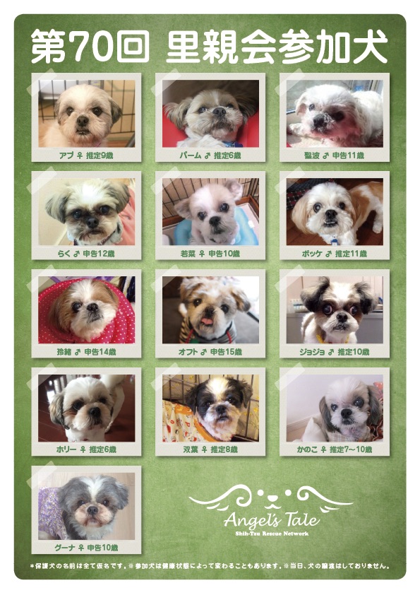 しばらく潜伏してしまってました〜(;^_^A オフ会は欠席でしたが、皆さんのブログで楽しませてもらいました! ありがとうございます♪ さて、卒業犬といえば、 数少ない(;^_^A、元・我が家の預かりっこから、時々、幸せ報告やお写真いただいています! なかなか報告してなくてすみませんっ。 つい、ひとりニンマリとして、 満足しきってしまいますね〜。 初の女子預かりっこAGGちゃん 亀の子たわしのオバケを思い出させる可愛いポーズ お顔が見えない寝ている写真でも、 私からすると見所があります(^-^) 毛のツヤが良くなったなー、とか。 しっぽ伸びたーとか。 オフ会で卒業犬アンちゃんと♪ とっても可愛いおそろの服で。 シーズー女子達の笑顔のサービスカットは難しいよね〜。 AGGちゃんママ、み〜さんのブログで、 「薄々、予想はしていたけれど…」 のフレーズにウケた(*^o^*) 思わせぶりなまぶたも見えなくなり、 ますます姫になってるAGGちゃんです。 次はあのこを紹介します(^_−)−☆ |