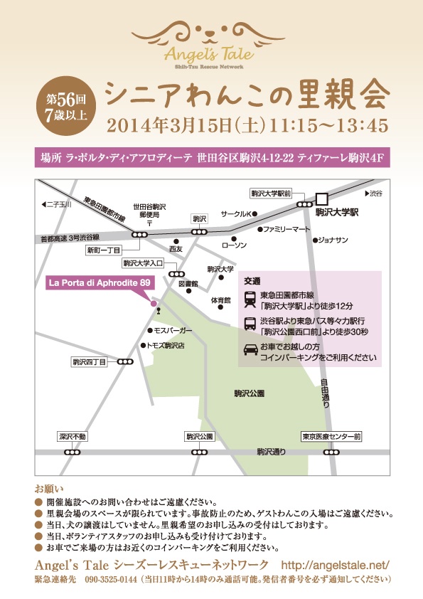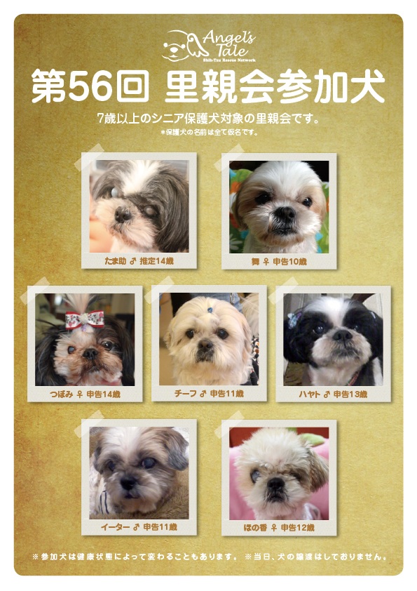 今朝のむとうさん 今日は、シニアわんこ限定!の里親会。 なので、 お子さまでヤングなむとうさんはお留守番でした。 里親会会場は、ムトと参加した愛犬写真教室の会場でもあった、癒しの空間「アフロディーテ」です。 △写真教室での1枚 アフロディーテでは、わんこ好きに嬉しいイベントが開催されています。 私は時々(まれ?に)、ヨガに行ってます! 人対象のヨガですが、犬を連れて行っても、もちろん、怒られませんよ♪ そんな犬フレンドリーな会場です。 さて、 今日の会場風景♪ 舞ちゃん イーター たま助 つぼみちゃん ハヤト 女装バージョン チーフ 女装バージョン ほのかちゃん この後、ベッドのすき間を狙う第二のオンナが(・・;) ご支援金プロジェクト 販売の為に提供して下さった、愛情こもった手作り品などの数々。 いつもありがとうございます! 靴を脱いで、床に座ったりしながら、 思い思いの場所でくつろぐわんことの対面。 いつもの里親会とは違った、和やかな家にいるときのようなリラックスした雰囲気でした! ご来場ありがとうございましたo(^_^)o