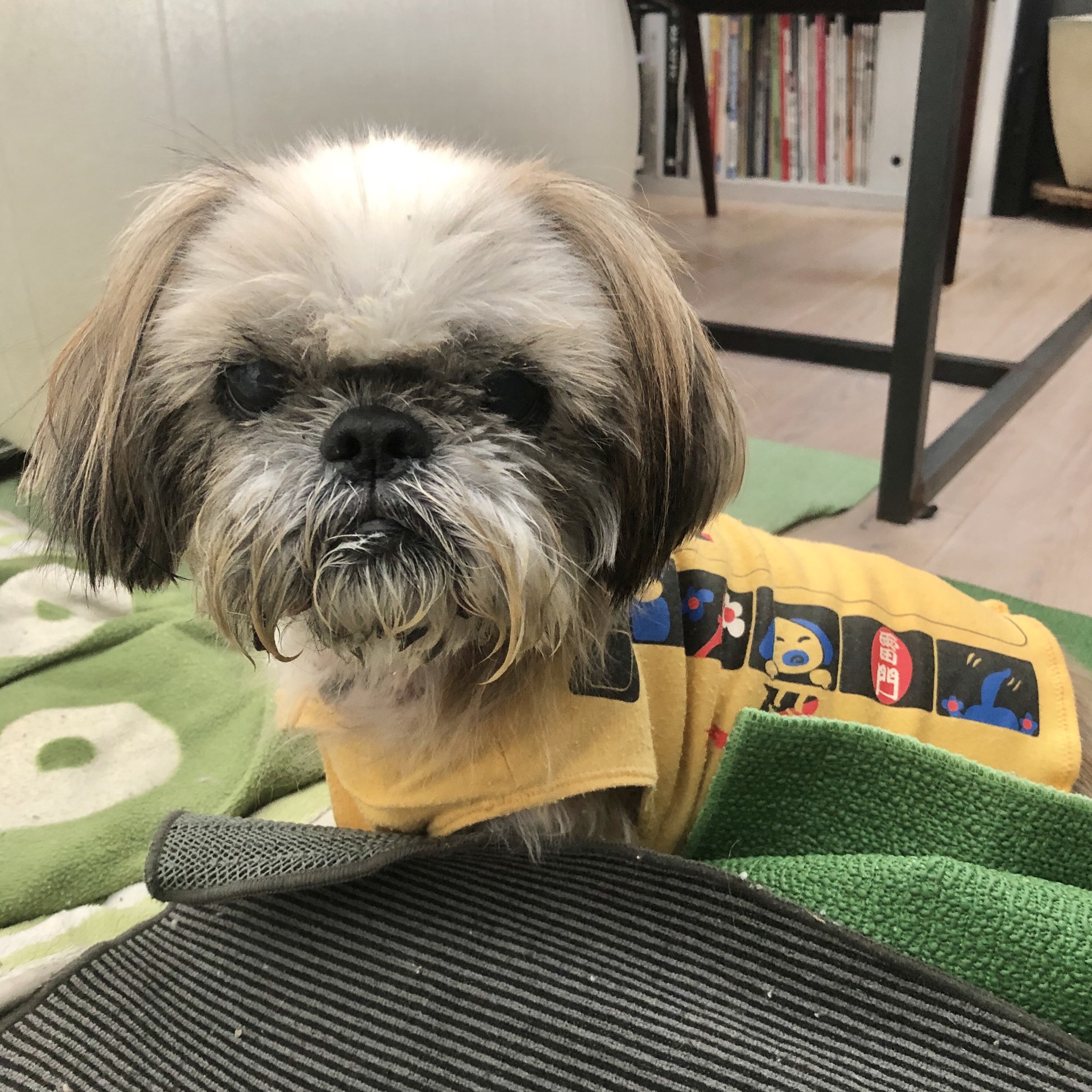 お店で、電気式びわ温灸をしてもらったハラミちゃん。 嫌がる事なく、大人しくしています。 うとうと(_ _).。o○ 気持ちいいみたいです♪ おふろも入りました。 くすぶる不満。 (後に爆発) 大先生のように、 みんなを厳しい視線で監視します(^_^;) 家ではしませんが、くっついてきて、 すべてを自分の支配下に置こうとしている気さえします。 やはり、、、 掃除機には一切どいてくれません! 帰りは雨なので大人しく、バッグにイン! 楽々、お供できるハラミちゃんです♪ ★ここだけプロフィール★ ポリシー:不満があったらハッキリ伝える ひみつ:時々大きな声で寝言を言う 食事:豪快な食べっぷりと飲みっぷり 引き際:早め 記憶力:高い 好きなフレーズ:わーわーわー 得意な声まね:猫、にわとり 得意な顔まね:研ナオコ 嫌いなこと:目薬 気になること:肉なのか魚なのか 似合う色:さくら色 飼い主になったら出来ること:ギャップ萌え トリビア:実はチョビベロでなくて下唇 テーマ曲:粉雪 有効成分:ブレない女成分ハラミチン配合 ラインスタンプ「ハラミちゃんのきもち」 リリース! ハラミはAngel's Taleの保護犬です ツンデレ系シーズー女子・ハラミ先輩★里親募集中! (仮名・メス・申告12才) 日々の様子 >>>ハラミ日記 ハラミについて>>>プロフィール 保護時の検診>>>代表ブログ 保護時の様子>>>プチステイ先