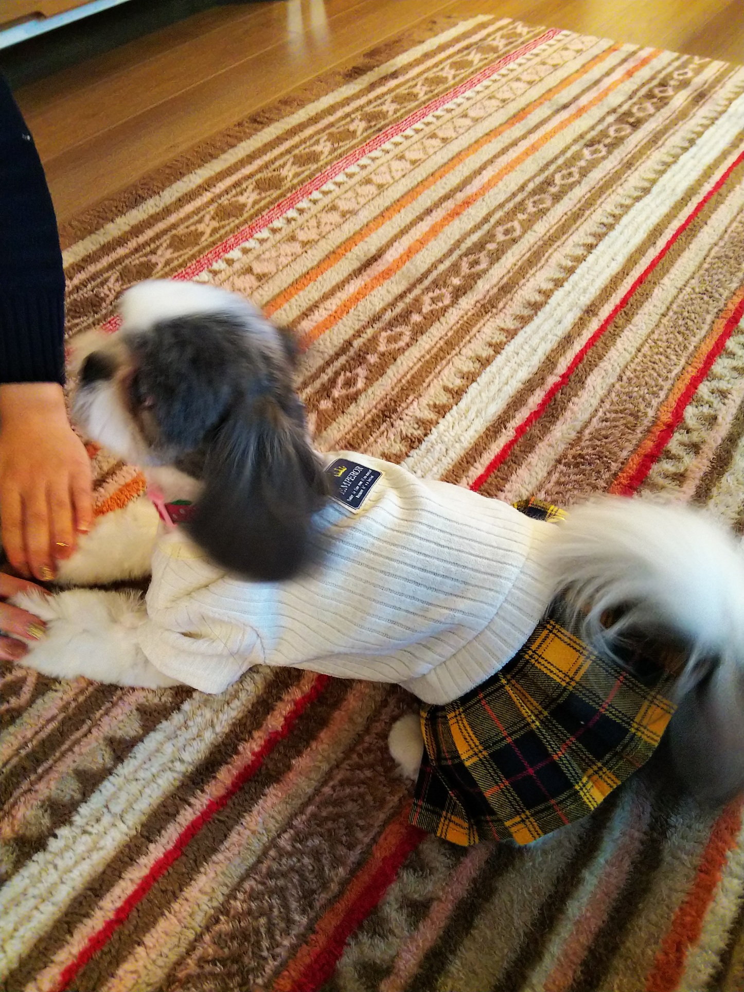 ★N様からのお便り こんばんは。 またまた前回の幸せ報告から2か月経過しました(ほんとあっという間に時が過ぎます(><))ので、近況報告をさせていただきます。 ≪りもちゃんの年末年始≫ お正月はきれいなりもちゃんでいてほしく、12月は年末ギリギリにトリミングサロンを予約したため、何だか真っ黒になってしまったりもちゃん(今年は雨が少ないので、どうしてもお散歩にいくとほこりで真っ黒になってしまいます) 自宅でシャンプーに初チャレンジ!! 鳴いたり騒いだりはしないのですが、ずっと震えていてかわいそうになってしまいました(りもちゃん、ごめんね(T T)) 年越しは家族と一緒にこたつで歌番組をまったり観て、元日は初もうでに行きました。 帰りは一駅だけ電車にもチャレンジ!とてもおとなしいので、近くにいたおばあさんに「生きてるの?」と聞かれてしまいました。←ぬいぐるみではありませんっ! 自宅では相変わらずはっちゃけてるりもちゃん。おもちゃで遊んではそのままおもちゃを枕に寝落ちzzz ←おもちゃ片付けようね。 また最近はスカートを好んで着せています。(せっかく女の子だし、先代犬は男の子だったので) 初売りでは犬用の福袋を購入。だいぶお洋服も増えてきました 桜の季節になったら、かわいいカッコをさせてお花見にでも行こうと思います♪ ではでは、毎日寒いので、お身体ご自愛ください。 ϵ( 'Θ' )϶ パピコメ ϵ( 'Θ' )϶ また長々と温めてしまいましたm(_ _)m それにしても、おこたを囲む写真を見たとき、 りもちゃんドコ!?って、、一瞬わからなかったけも、ちょこんと家族の一員してる後ろ姿を見て、ほっこりしました♡